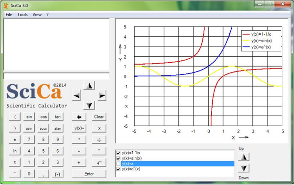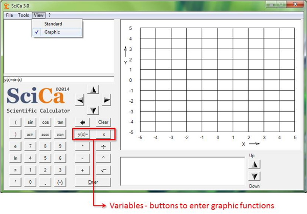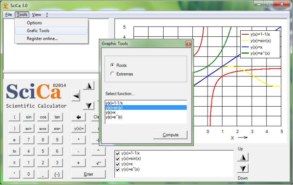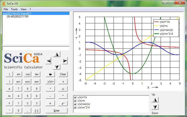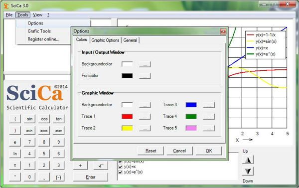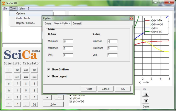 SciCa 3.0Home... Overview Computation / Analysis SciCa 3.0 computes the result of any valid and correct mathematical expression that is entered into the input field. The formula can be entered using the provided number pad or with the keypoard. After pressing the "Enter" button the expression as well as the result are shown in the output window. If the entered formula contains a syntax error or a mathematical error (e.g. division by zero), an error message will appear, identifying the type and location of the error in the expression. ![]() In order to display and analyze two dimensional functions graphically, the item "Graphic" in the "View" menu must be selected. The function can be entered via the keyboard or using the provided buttons from the number-pad that already contain the correct variable definitions "y(x)=" and "x". Please note that only the variable names "x" (for independent variable) and "y" (for dependent variable) can be used...other variable names will lead to a syntax error. ![]() A maximum of five functions can be stored by the application at the same time. The functions are shown in the list box. Selecting and de-selecting the check box shows or hides the corresponding function, respectively. You can change the order of the functions in the list using the "Up" and "Down" buttons. To remove a function from the list, select it in the list box and press the "Clear" button. ![]() The graphic properties of the chart can be adjusted with "Tools" - "Options". In the tab "Colors" the background color as well as the colors for the traces can be selected. ![]() In the tab "Graphic Options" the properties for x and y axis can be adapted and you can select whether gridlines and the legend should be displayed or not. The "Reset" button will restore all values to the original default. ![]() SciCa 3.0 offers a tool to analyze the characteristic points of the displayed functions. To use it, select "Graphic Tools" from the "Tools" menu. Here you can select which points you would like to determine ("Roots" or "Extremas") for which function. Click "Compute" and the results will be displayed in the graphic window. ![]() To clear the chart from characteristic points, simply select another function and the points will disappear from the graphic. Please note that these characteristic points are computed numerically, which means that the results will never be exact. In the example below you can see clearly that there is a small difference of the displayed roots to the exact results. The exact results for the roots of the function y(x)=sin(x) are x = -PI, x = 0, x = PI. The precision with which SciCa computes the characteristic points is 1/5000 of the x range displayed in the graphic window. Therefore, in order to increase the precision, simply select a smaller x range around the characteristic point, using "Tools" - "Options" - "Graphic Options". ![]() |