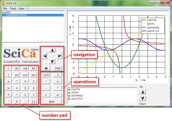 SciCa 3.0Home... Overview Computation / Analysis SciCa 3.0 is an application to solve complex mathematical expressions, which can be entered via the keyboard, or by using the number pad on the interface. After you press "Enter", the expression along with the result are displayed in the output window... ![]() ...In addition, the software can also process two dimensional functions, i.e. y = y(x) functions. In order to display and work with these functions, the item "Graphic" from the "View" menu must be selected. ![]() |