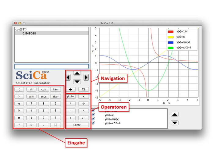 SciCa 3.0Home... Übersicht Berechnung / Grafik SciCa 3.0 ist eine Anwendung zur Auswertung komplexer mathematischer Ausdrücke, die mit der Tastatur oder über das bereitgestellte Nummern-Pad eingegeben werden kӧnnen. Nachdem der Ausdruck mit "Enter" bestӓtigt wurde, erscheint die Formel und das Ergebnis im Ausgabe Fenster... ![]() ...Weiterhin kann die Software genutzt werden um zwei-dimensionale Funktionen (y = y(x) Funktionen) darzustellen und zu analysieren.s ![]() |